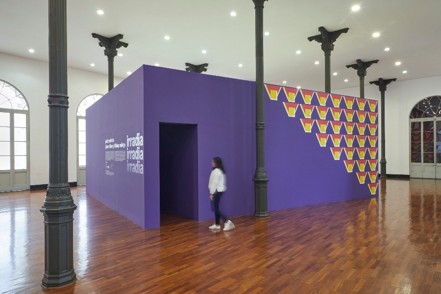 Para la primera entrega de Irradia. Arte + Tecnología, iniciativa conjunta del Museo de Arte de Lima – MALI y la Fundación Telefónica, se invitó a los artistas Fátima Rodrigo y Jaime Oliver a desarrollar una obra para cuatro canales de video y ocho canales de audio. El resultado fue la instalación titulada Plató América, que profundiza los campos de investigación de ambos artistas. La pieza explora los vínculos entre la abstracción y la industria del espectáculo latinoamericana, la simbología precolombina, las ondas sonoras sintéticas y la música experimental de vanguardia; cuestionando la relación entre lo contemporáneo y lo que se asume como antiguo o lejano.