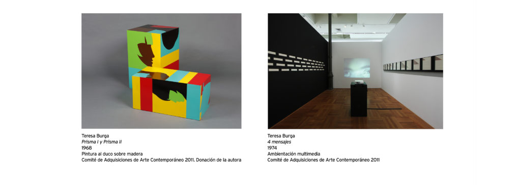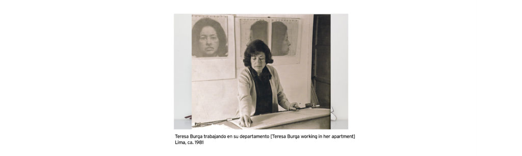 Teresa Burga (Iquitos, 1935 – Lima, 2021) nació en la ciudad de Iquitos, Perú, e inició sus estudios de arte en la Pontificia Universidad Católica del Perú (1964) desde donde realiza un trabajo centrado en la figuración, pero ya con atisbos que proponen una exploración de la pintura y el grabado. En 1966 que Burga integra el grupo de vanguardia Arte Nuevo (1966-1967), colectivo de renovación plástica interesado en el arte pop, minimalista, arte op y los happenings. Es junto a la artista Gloria Gómez Sánchez, la segunda integrante mujer del colectivo, en este momento empieza a trabajar en un repertorio visual que cuestiona el rol de la mujer en una sociedad predominantemente masculina, centrando su interés en temas de género, feminidad y sexualidad constantes en su producción a partir de entonces.