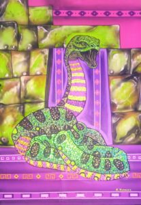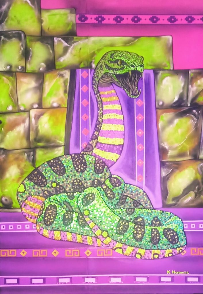 “Me inspiré en la obra el cazador ashanika porque es un hombre que busca alimento para él y su familia , cazando en lo ríos y en la selva, visualiza y se asombra de la cantidad de animales, donde la serpiente por su tamaño majestuosidad lo impacta por sus ojos cristalinos y se mimetiza con los colores y texturas de la selva. Es por ello que pinto esta obra porque sabemos que la cultura inca llego a extenderse por todo el territorio peruano y el amaru fue representado en su cosmovisión andina amazónica. En la época incaica era símbolo de la sabiduría, se le colocaba en las casas del saber como símbolo totémico.”