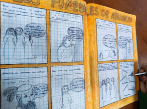 “Al revisar las obras, biografías e historias en el MALI surgieron varias ideas que muy bien se puede trabajar con la información, detallada y con esa propuesta abierta que ustedes hacen en bien de la cultura y la educación. Entonces decidí trabajar Los Funerales de Atahualpa en versión historieta. Partí de los saberes previos de mis estudiantes en cuanto a sus conocimientos sobre Atahualpa, luego sobre la pintura, conocer al artista pintor y sus obras. A la vez me sentí identificado con la historia de nuestro país, conjuntamente con mis estudiantes.