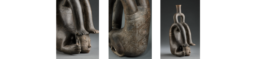 – Cupisnique (1500 – 500 a.C.). Botella con representación de contorsionista. Cerámica modelada e incisa. Donación Colección Petrus y Verónica Fernandini.