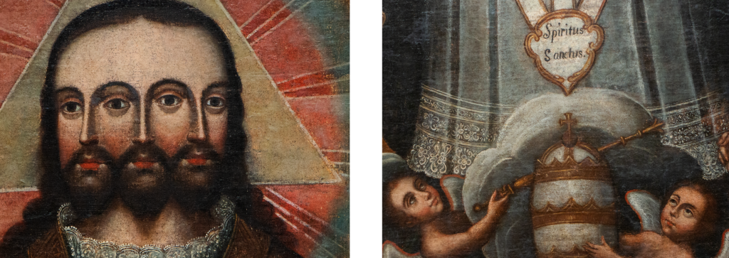 Varios pintores coloniales representaron el dogma católico de la Trinidad bajo la imagen de una sola figura con tres rostros fusionados, los cuales suman cuatro ojos, tres narices y tres bocas. Llamada “Trinidad Trifacial”, esta invención de origen medieval seguía vigente en América mientras era cuestionada en Europa, donde apenas aparecía ya en estampas didácticas. Se consideraba que una imagen de este tipo resultaba confusa, ya que muchos fieles podían pensar que Dios tenía el aspecto de una criatura monstruosa.