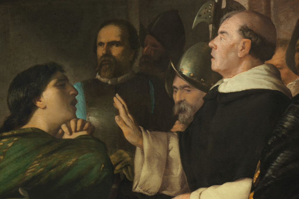 “Los funerales de Atahualpa” es reconocida como una pieza inaugural de la pintura de historia en América del Sur. Por su enorme formato, su inédito tema local y el dramatismo de la escena representada, el cuadro cautivó a la crítica europea y americana de su época. Montero se inspiró en un breve pasaje sobre la muerte del Inca tomado de la célebre Historia de la conquista del Perú de William H. Prescott (1847). En las exequias de Atahualpa en Cajamarca, presididas por fray Vicente de Valverde en presencia de Francisco Pizarro y de sus hombres, las hermanas y mujeres del Inca entran en la iglesia para impedir la ceremonia, reclamando honores para Atahualpa, y pidiendo enterrarse con él. Al terminar su gran cuadro en Florencia en 1867, Montero inició una larga travesía de regreso al Perú, exhibiendo su obra con éxito en Río de Janeiro, Montevideo, Buenos Aires y Lima. Reproducida luego en postales, billetes, estampillas y libros escolares, Los funerales de Atahualpa de Montero se convirtió tempranamente en una pieza central de la imagen oficial del país. (por Natalia Majluf)