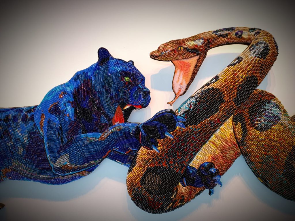 Harry Chávez. Donde muerde el mito es primera presentación en el museo de la obra de este destacado artista peruano, donde la confrontación entre la serpiente y el felino se convierte en una potente metáfora del conflicto vital, la transformación y la resistencia.