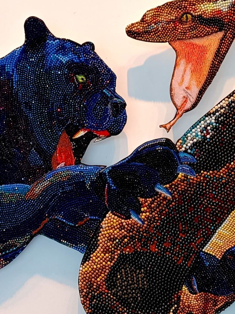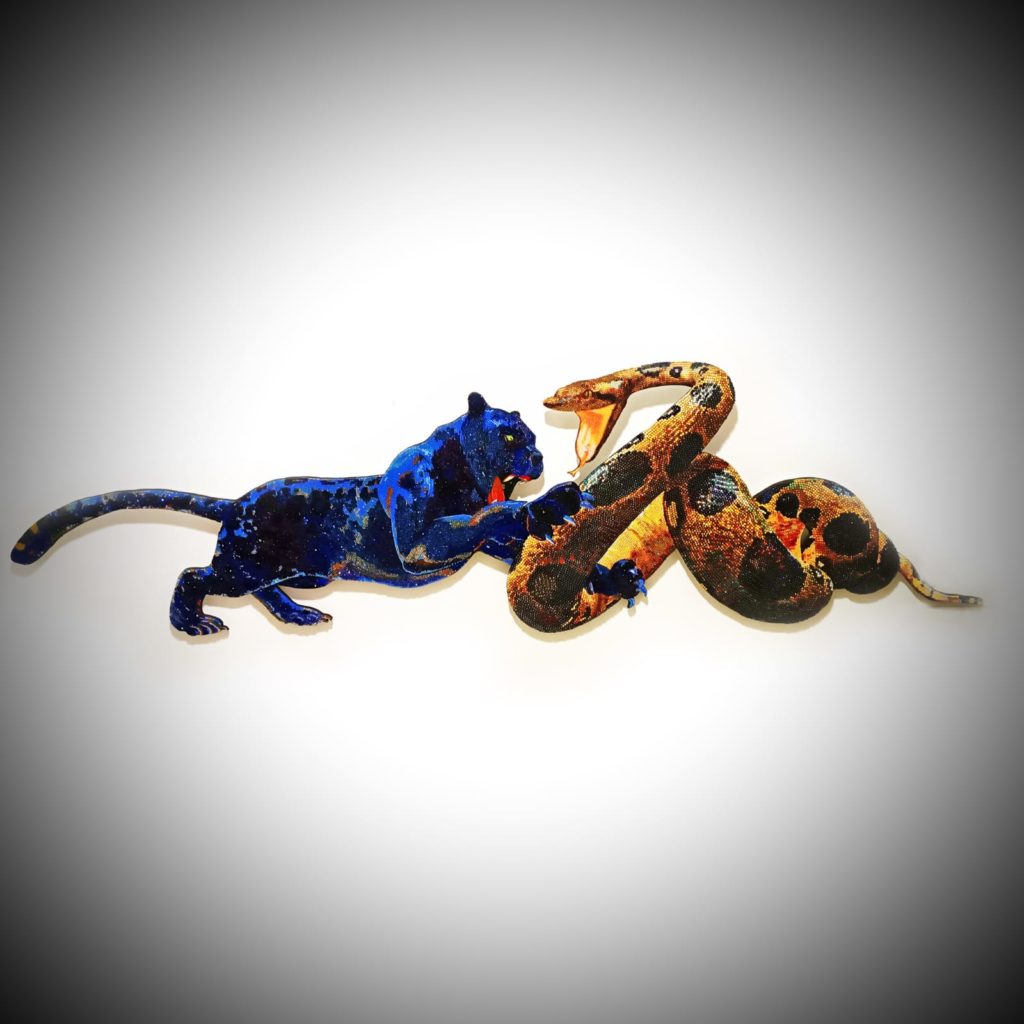 A través de las obras Salto mortal y Nacimiento del dragón, Chávez propone escenas donde el movimiento y la metamorfosis cobran forma. En ellas, la serpiente y el felino no solo remiten a lo animal, sino también a memorias corporales, territorios en disputa y pulsiones colectivas. El artista no ofrece una narrativa cerrada: construye mitologías contemporáneas que invitan a pensar lo híbrido, lo que cambia de piel para seguir existiendo.