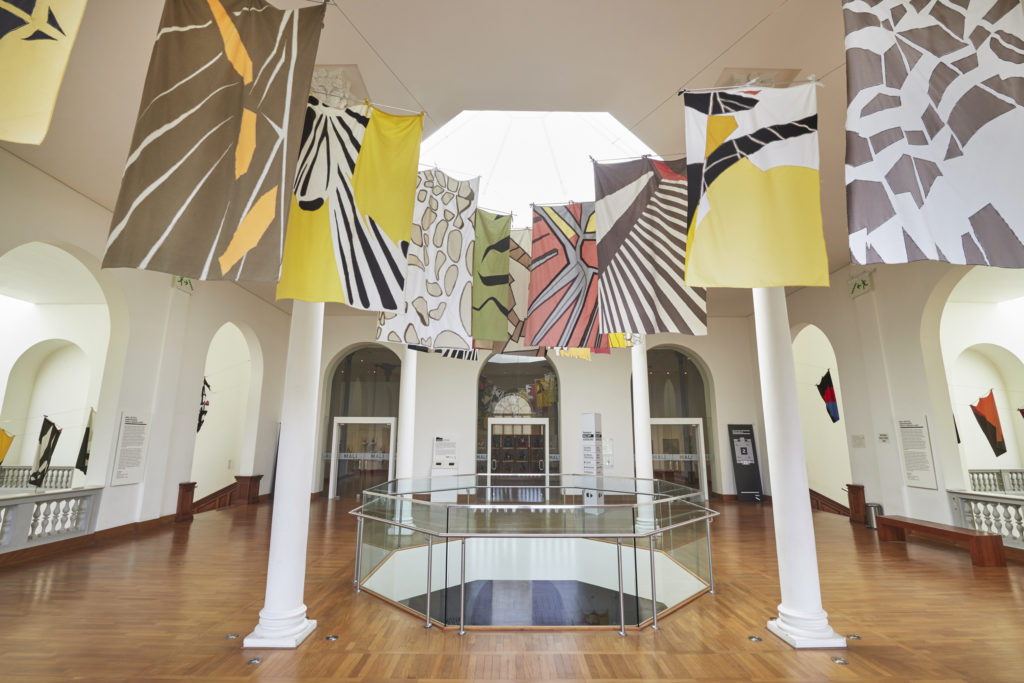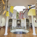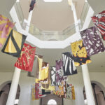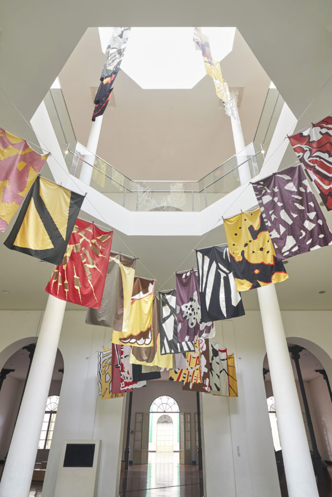 Para el primer espacio, Vargas Lugo propone una intervención con banderas cuyos patrones están inspirados en los diseños de las alas de las mariposas, serie que forma parte de su investigación Nueva Vexilología.