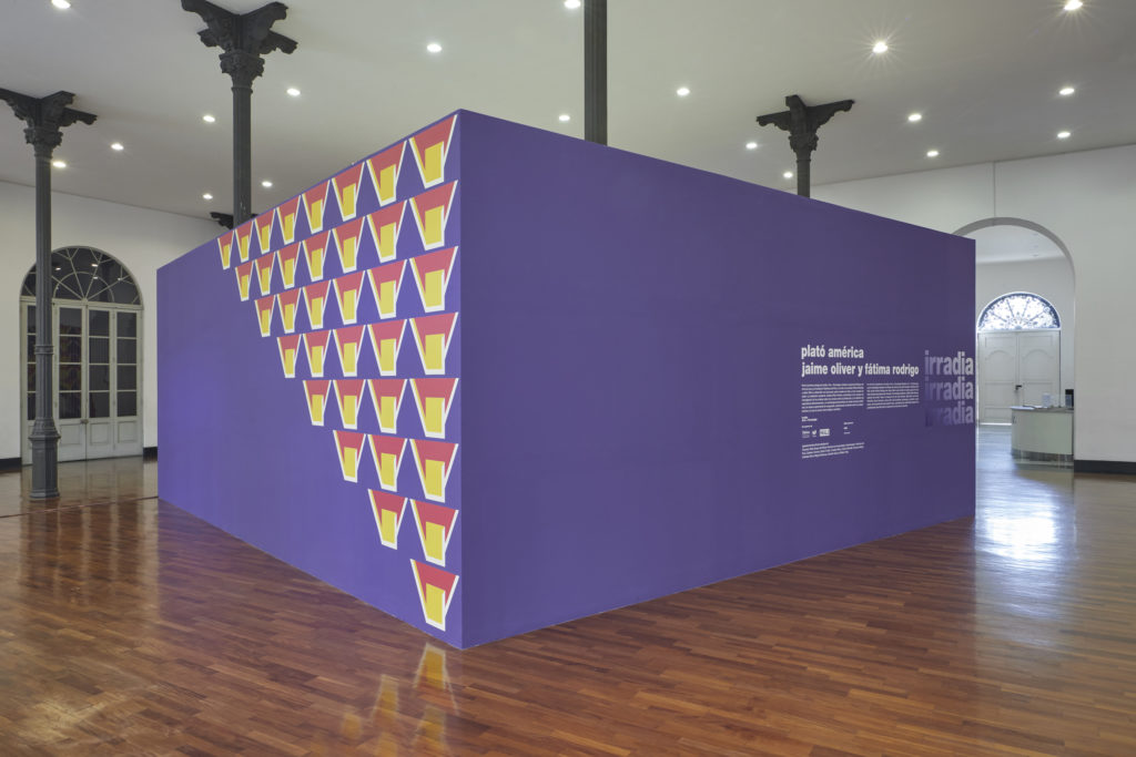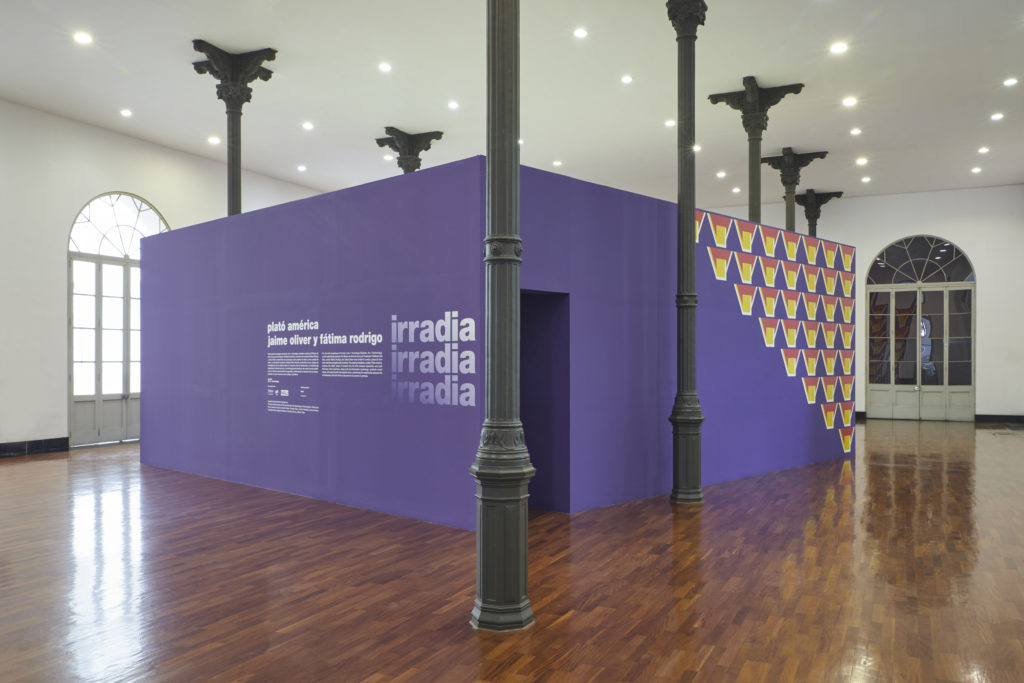 Para la primera entrega de Irradia. Arte + Tecnología, iniciativa conjunta del Museo de Arte de Lima y Fundación Telefónica del Perú, se invitó a los artistas Jaime Oliver y Fátima Rodrigo a desarrollar una obra para cuatro canales de video y ocho canales de audio. La instalación resultante, titulada Plató América, profundizó en los campos de investigación de los artistas sobre los vínculos entre la abstracción y la industria del espectáculo latinoamericana, la simbología precolombina, las ondas sonoras sintéticas y la música experimental de vanguardia; cuestionando la relación entre lo contemporáneo y lo que se asume como antiguo o primitivo.