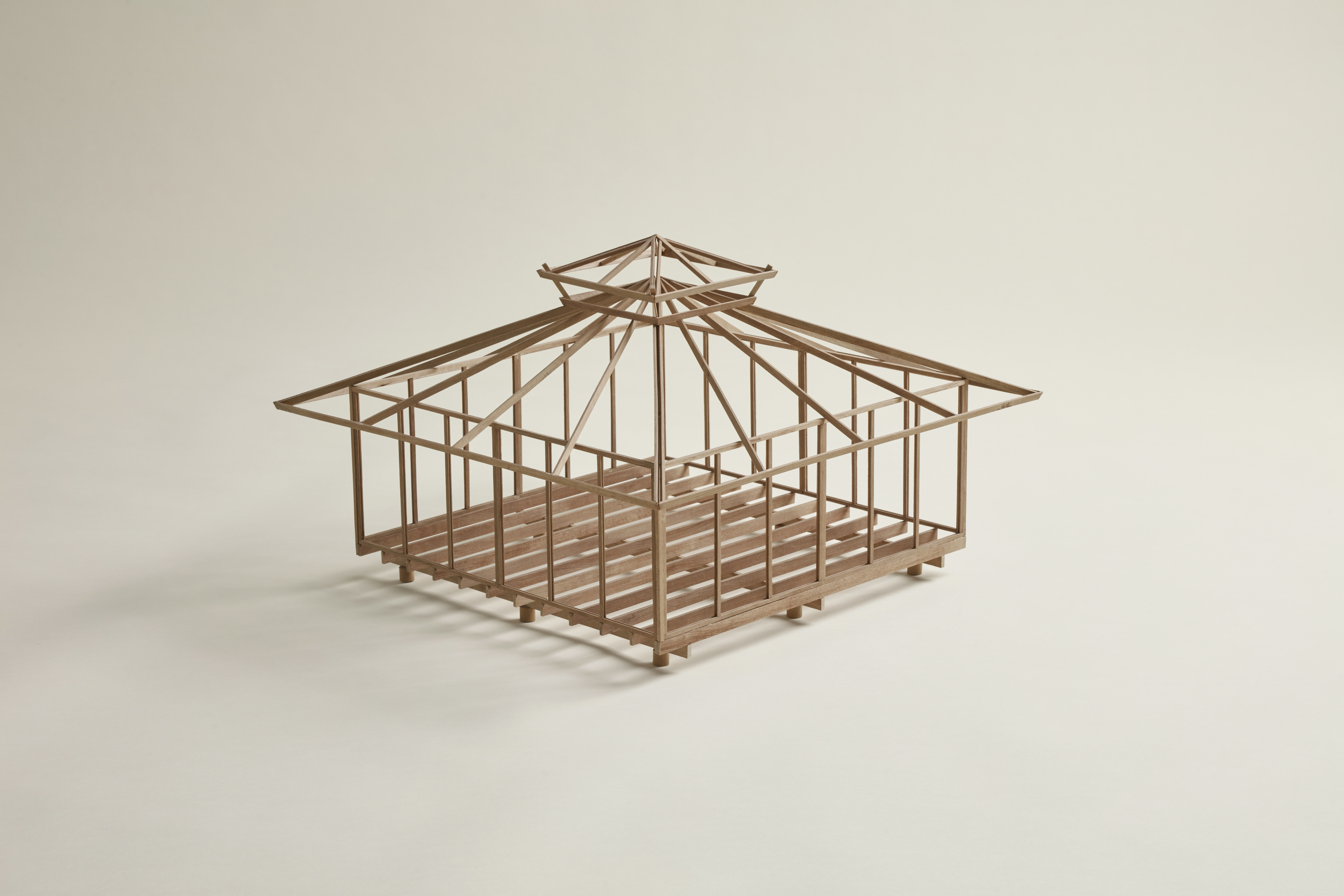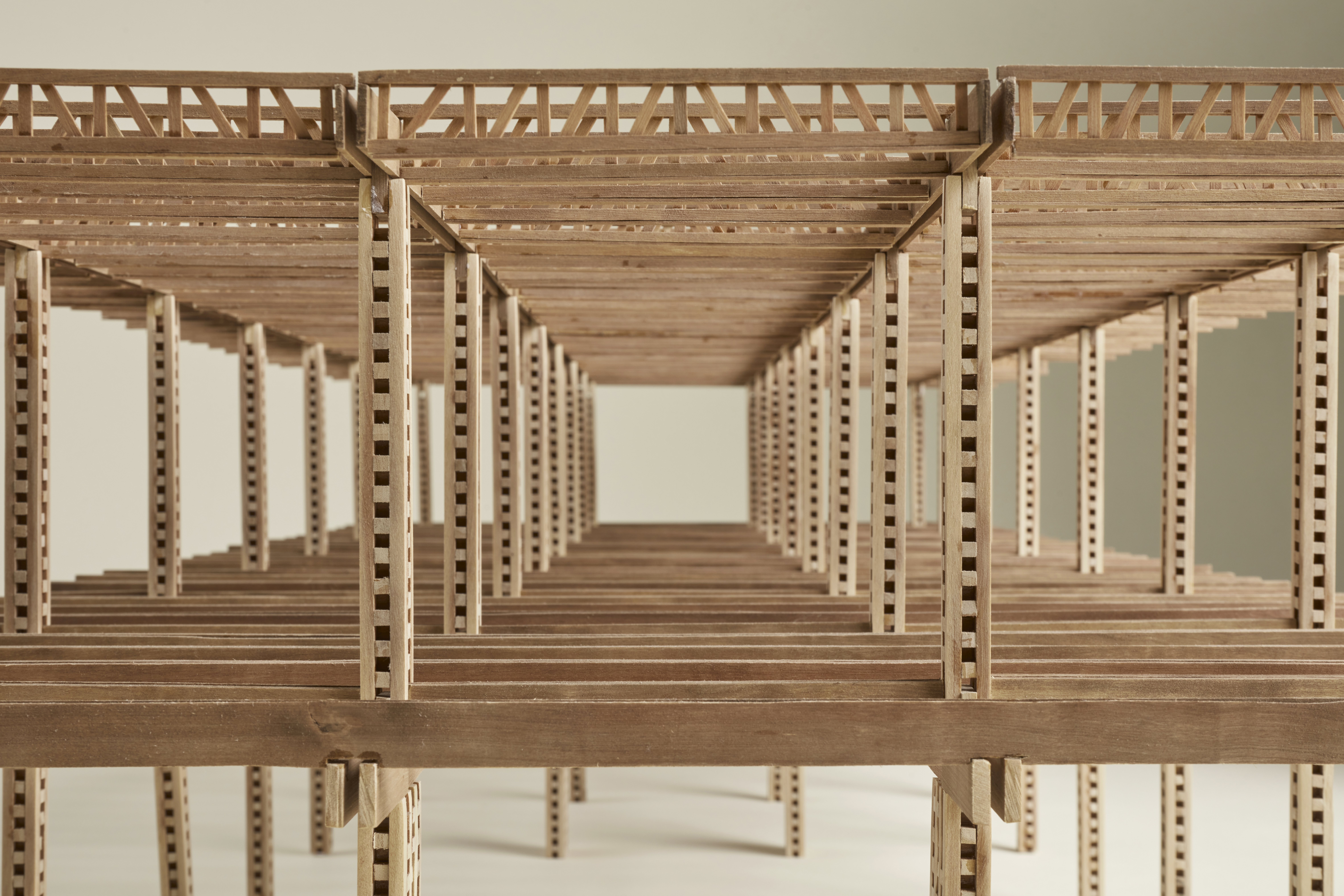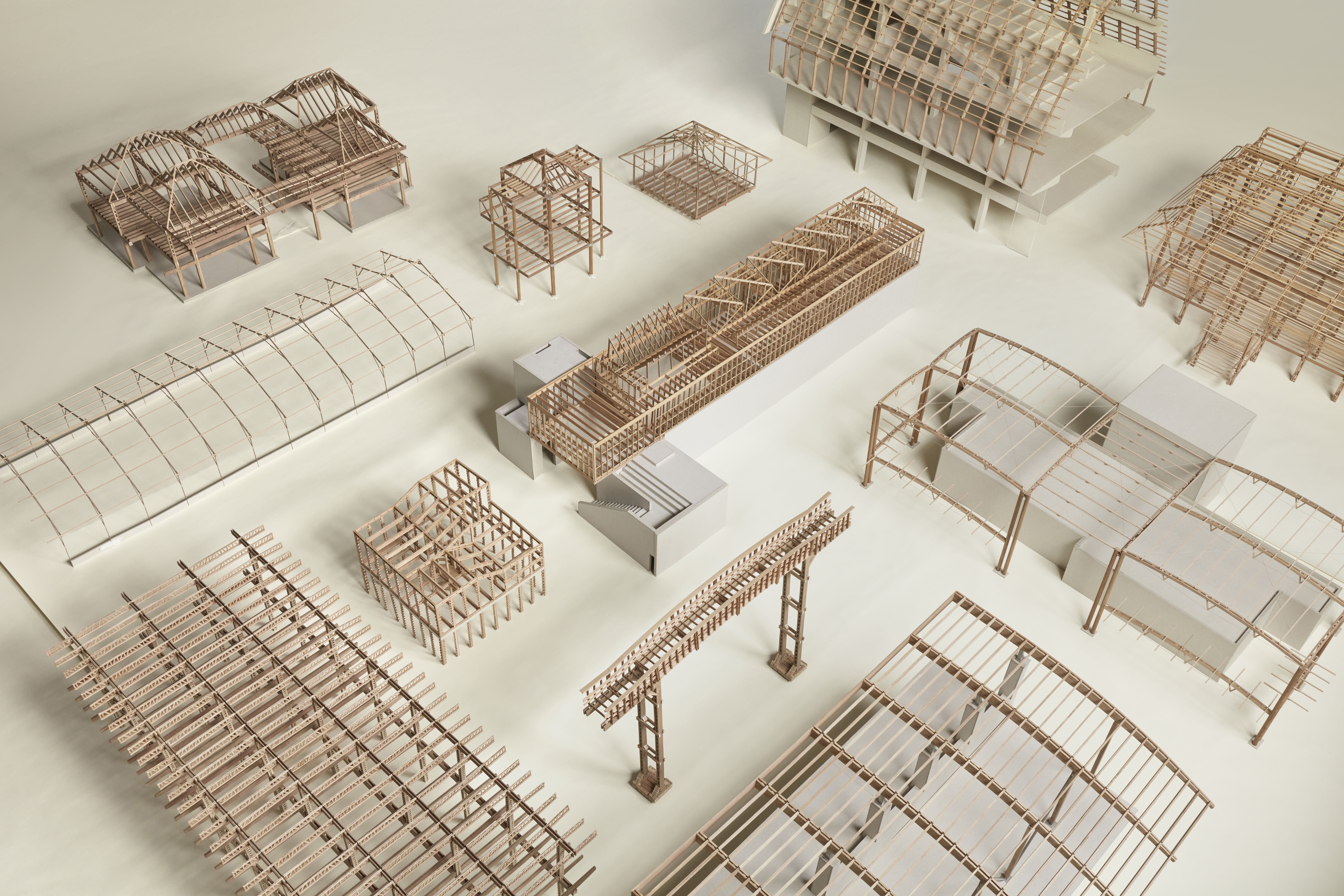 La presente muestra despliega una selección de proyectos de madera concebidos, dimensionados y eventualmente construidos por Luis Takahashi. Se exponen dibujos además de maquetas estructurales 1:20 y uniones estructurales 1:1 en las que es posible identificar un vasto repertorio de soluciones expresivo de una extraordinaria inteligencia constructiva. Los artefactos revelan los atributos técnicos característicos de la madera, así como sus potencialidades sensoriales y espaciales. La madera traza líneas en el bosque que Takahashi traslada con insólita exquisitez al papel y el espacio.