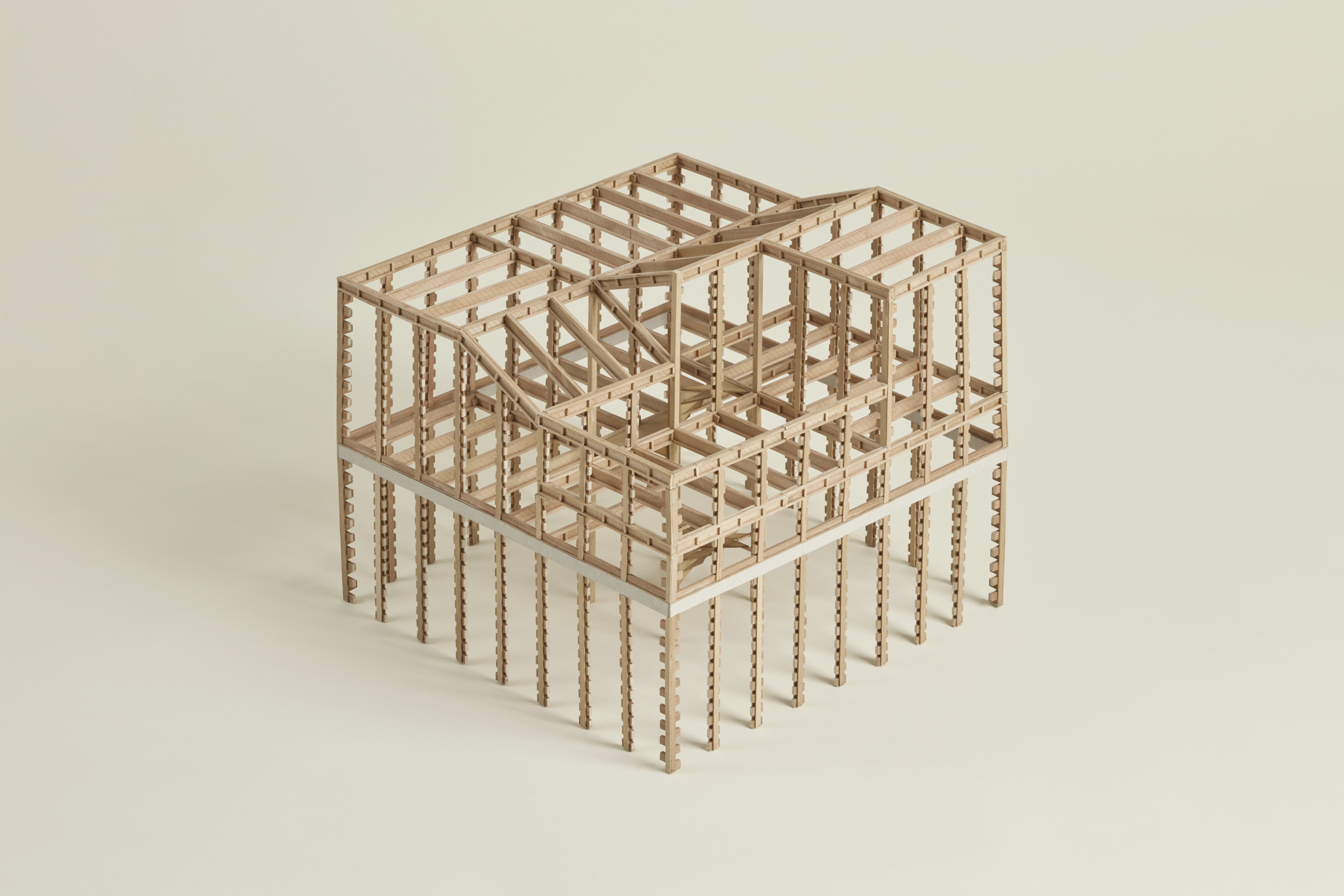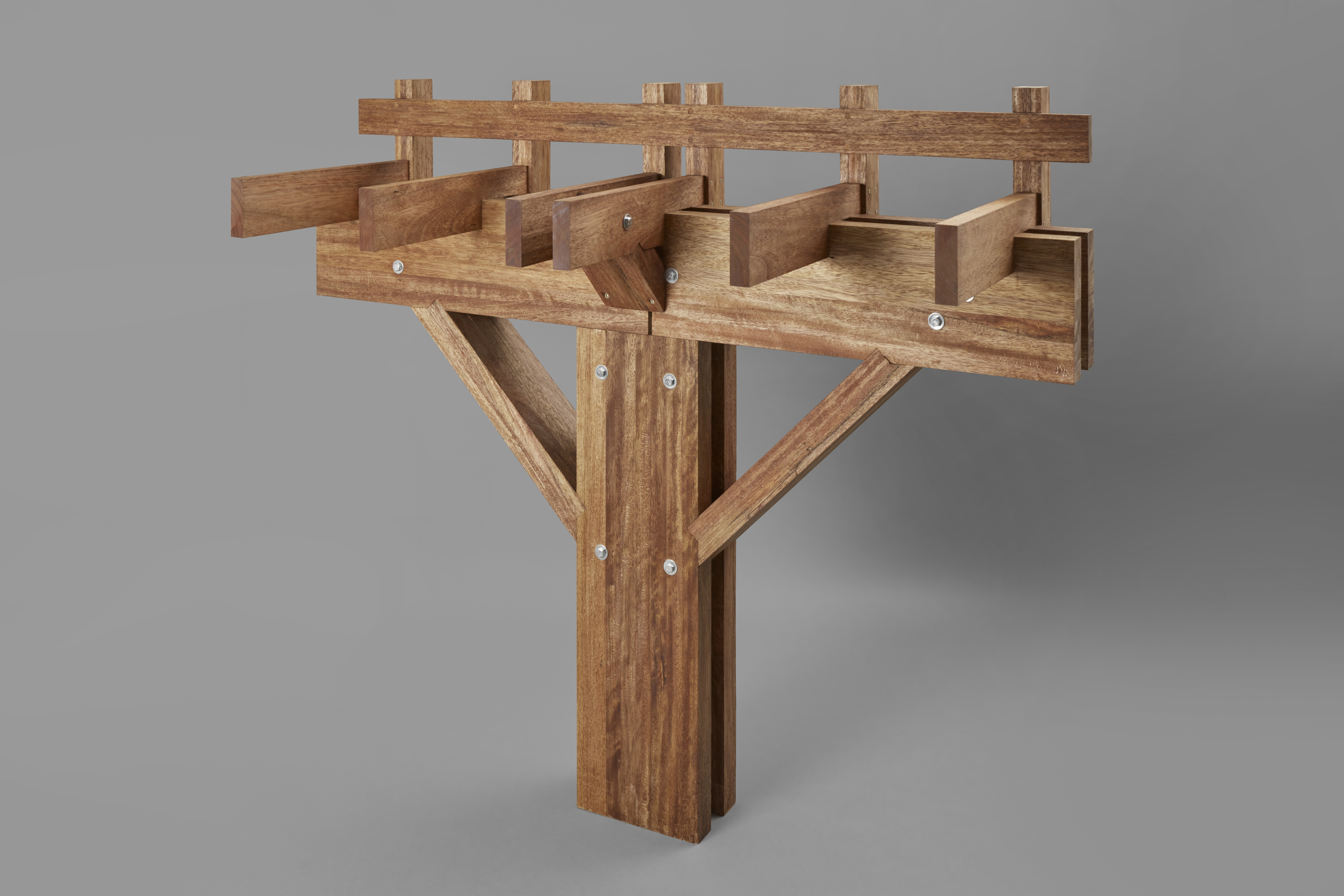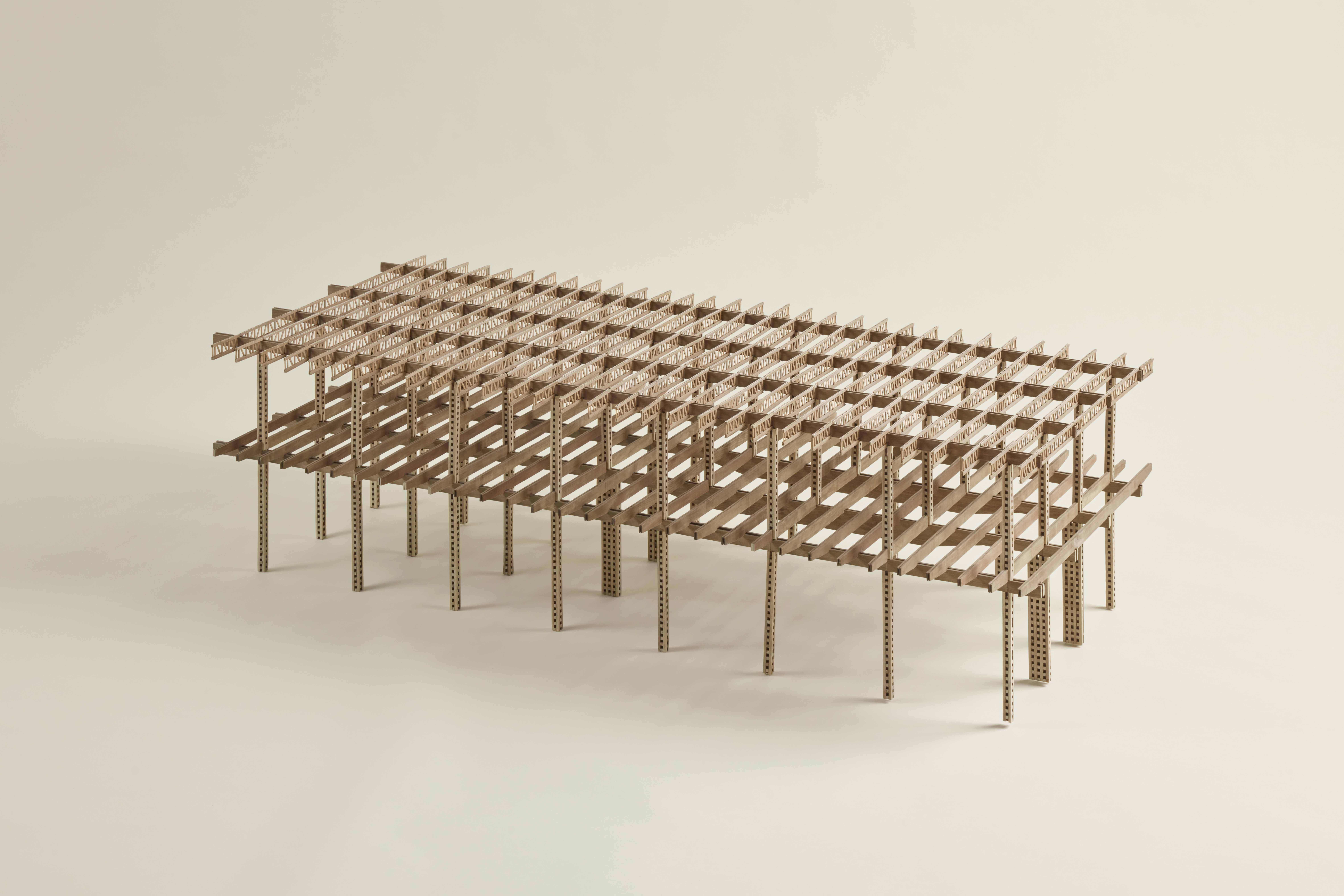 La presente muestra despliega una selección de proyectos de madera concebidos, dimensionados y eventualmente construidos por Luis Takahashi. Se exponen dibujos además de maquetas estructurales 1:20 y uniones estructurales 1:1 en las que es posible identificar un vasto repertorio de soluciones expresivo de una extraordinaria inteligencia constructiva. Los artefactos revelan los atributos técnicos característicos de la madera, así como sus potencialidades sensoriales y espaciales. La madera traza líneas en el bosque que Takahashi traslada con insólita exquisitez al papel y el espacio.